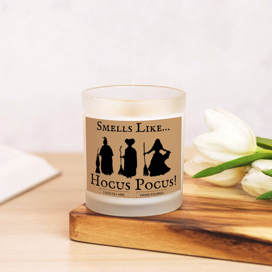 Cute Fall/Halloweeen Candle/ Hocus Pocus Quote/ Hand Poured Frosted Glass/ Wood Wick w/bamboo lid/ Choose your scent (11 oz)
