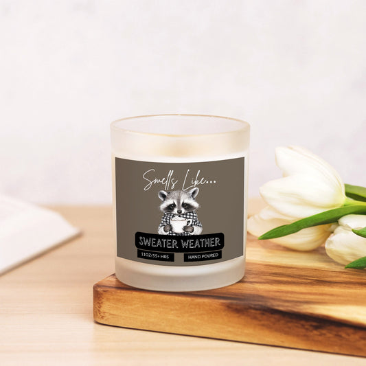 Cute Fall Racoon w/Coffee Hot Cocoa, Birthday, Houswarming, Coworker Gift, WoodWick, Bamboo Lid, 12 Scents/Frosted Glass Candle (Hand Poured 11 oz)