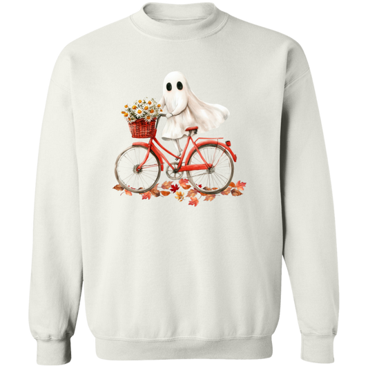 Cute Ghost on Vintage Bicycle Daisies/ Fall Pullover Sweatshirt in Cool Autumn Colors