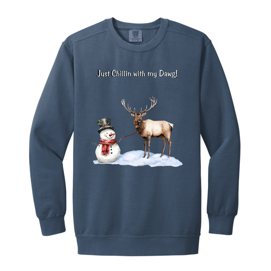 Snowman Chillin with Big Elk Reindeer Ladies Garment-Dyed Faded Crewneck Sweatshirt