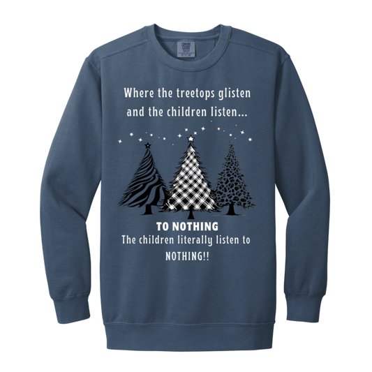 Tree Tops Glisten Children listen to Nothing Ladies Funny Faded Garment-Dyed Adult Crewneck Sweatshirt
